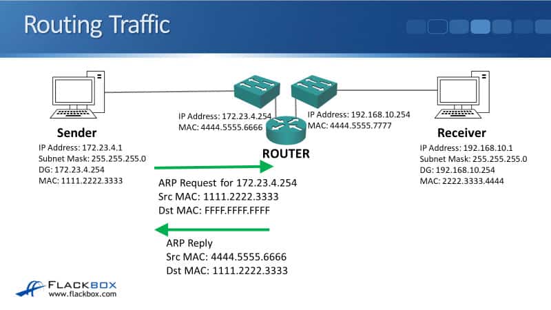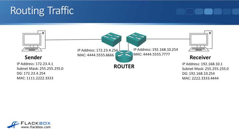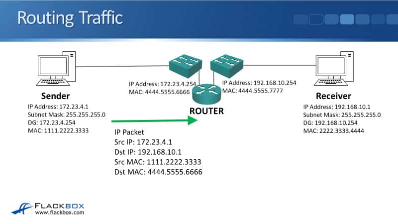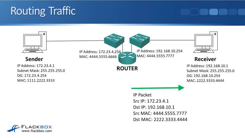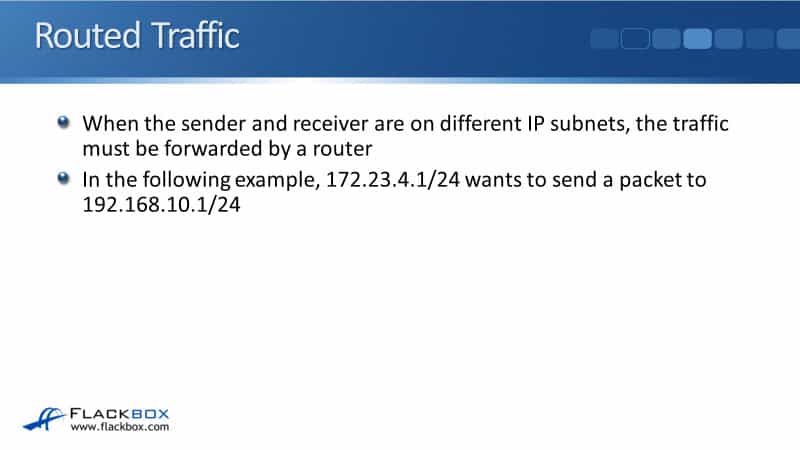 It knows not to do that because it compares its own IP address and subnet mask with the destination IP address, and it can see that it's on a different IP subnet. So, the sender knows that it has to send the traffic via a router.