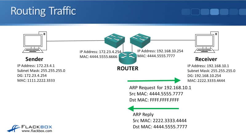 The ARP request would never get to the receiver. Also, we knew that when we send traffic between two different IP subnets, it has to be sent via a router. So, the sender is not going to send an ARP request for 192.168.10.1.