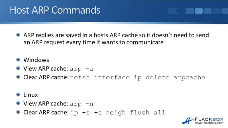 To view the ARP cache, we can do that on Windows with the arp -a command. On a Linux host, we use the arp -n command.