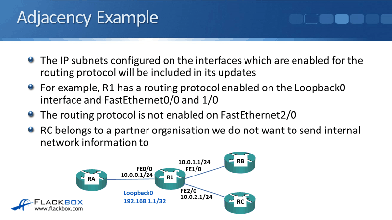 R1 will not send out or listen for hello packets on FastEthernet2/0 because we didn't enable the routing protocol on that interface. R1 will not form an adjacency with RC and it will not be giving out any network information to RC.