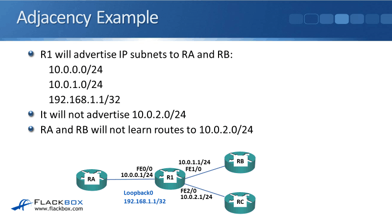 In our scenario, we're not going to be sending information to RC. RA and RB will not learn routes to 10.0.0/24 as well because we didn't include them in the routing protocol.