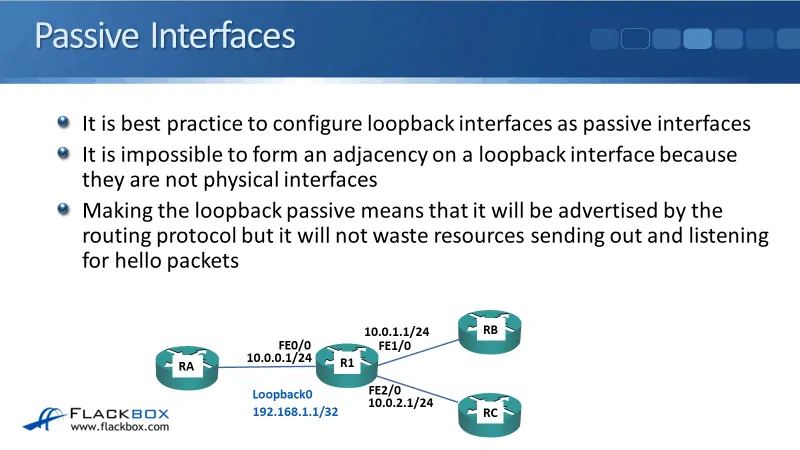 Making the loopback passive means that it will be advertised by the routing protocol. We want other routers to learn how to get to the loopback, but we don't want to waste resources by sending out and listening for hello packets. We already know that there's never going to be another router connected to that link.