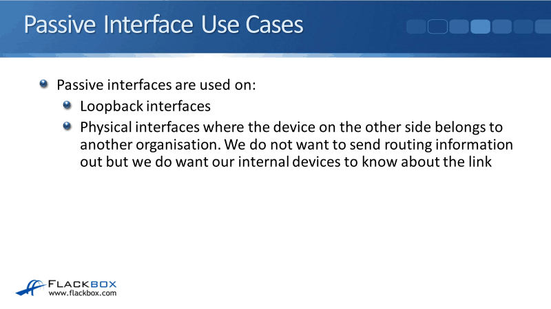 To summarize the use cases for the passive interfaces, these are used on our loopback interfaces and also on our physical interfaces. We don't want to send routing information to another organization or out to the device on the other side but we do want our other internal devices to know about the link.