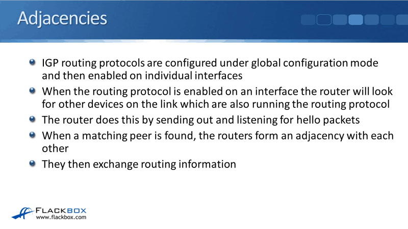 The router does this by sending out and listening for hello packets for that particular routing protocol. When a matching peer is found, the routers form an adjacency with each other and they exchange routing updates with one another.
