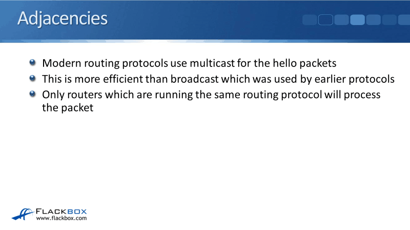 Modern routing protocols use multicast for the hello packets. This is more efficient than the broadcast that was used by earlier protocols like RIP version 1.