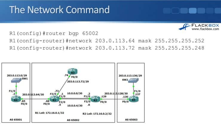 Unlike with an IGP, you cannot just advertise all of them in BGP in one go by entering “network 203.0.113.0 mask 255.255.255.0”.