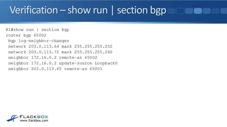 Once we have everything configured, to see all of our BGP commands in one place we can enter “show run | section bgp”. This is shown for R1 in the screenshot above.