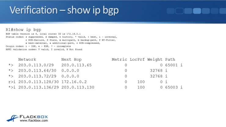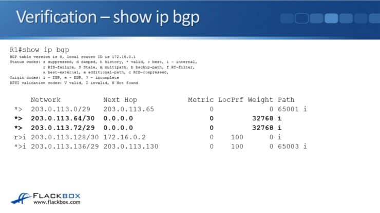 Let's go through these different routes... For 203.0.113.64 and 203.0.113.72, we see the next hop is 0.0.0.0. This means that the router is advertising them itself. There's a network statement on this router for those two networks.