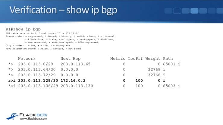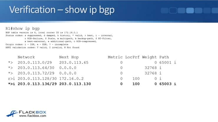 And lastly, we have 203.0.113.136 with the next hop of 203.0.113.130. That was the route that was advertised from R5 to R2, so it has a next hop of 203.0.113.130. R2 then passes that information on to R1 as well.