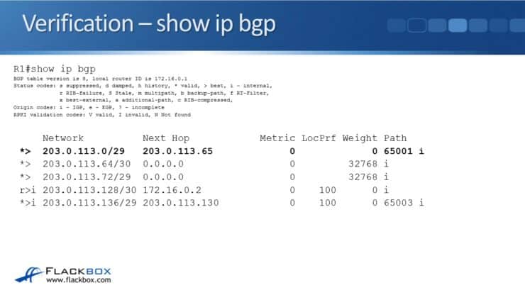 Then we have 203.0.113.0, with the next hop of 203.0.113.65. That is the route that was advertised from R4. R1 learns that it can get to 203.0.113.0 via R4.