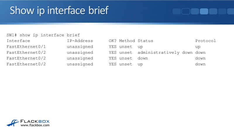 Below is an example output of ‘show ip interface brief’. You can see that FastEthernet0/1 is up/up, so that is all good. FastEthernet0/2 is administratively down, so you need to do a ‘no shutdown’ on the interface to bring it up.