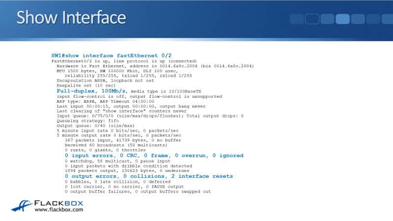 Usually, we'll do a ‘show interface’ and then specify interface like we've done here for FastEthernet0/2. We can see that it's set to full-duplex and the speed is 100Mb/s. We've got no input errors and no output errors, so that's a good sign.