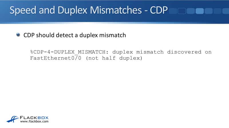 If a device has issues with auto-negotiating speed or duplex, then manually configuring both sides will normally solve that problem. If you do have a duplex mismatch, then CDP, Cisco Discovery Protocol, should detect that and it'll log it as you see in the example below. We've got a duplex mismatch discovered on FastEthernet0/0 (not half duplex).