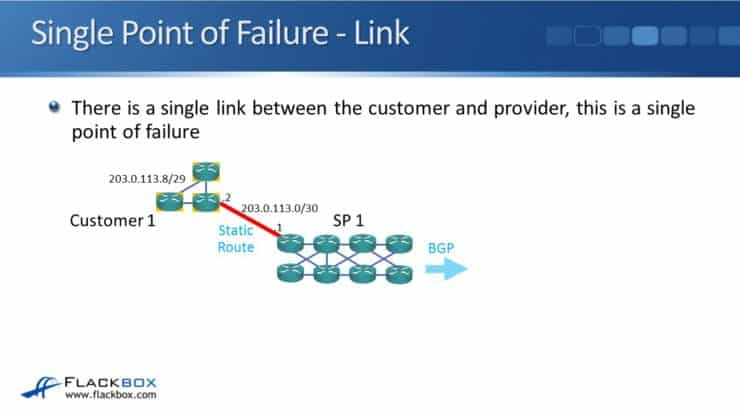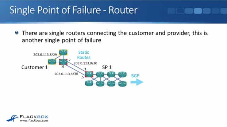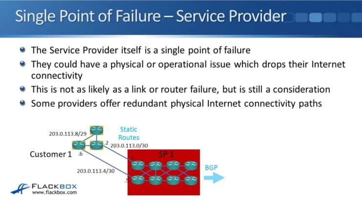 The service provider itself as a whole is a single point of failure. They could have a physical or operational issue which drops their connectivity to the rest of the Internet. In our previous example the customer has two connections, but they are both going through the same provider. If the provider goes down, then you have lost their internet access. That is a lot less likely than a physical link or a physical router failing, but it is still possible.