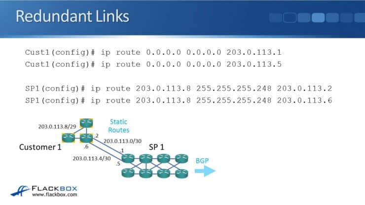 At the provider, we will have two routes for the customer's network of 203.0.113.8/29. One will point to 203.0.113.2 (the top link) and the other will point to 203.0.113.6 (the bottom link):