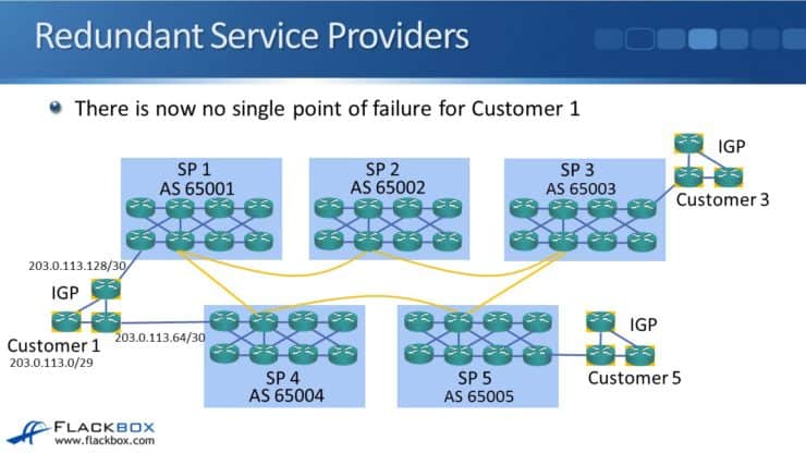In our example Customer 1 in the bottom left corner has their own AS number of 65010 and their own range of provider independent public IP addresses 203.0.113.0/29. They are peering with both Service Provider 1 with AS65001 and Service Provider 4 with AS65004. They advertise their public IP address range of 203.0.113.0/29 with BGP to both providers.