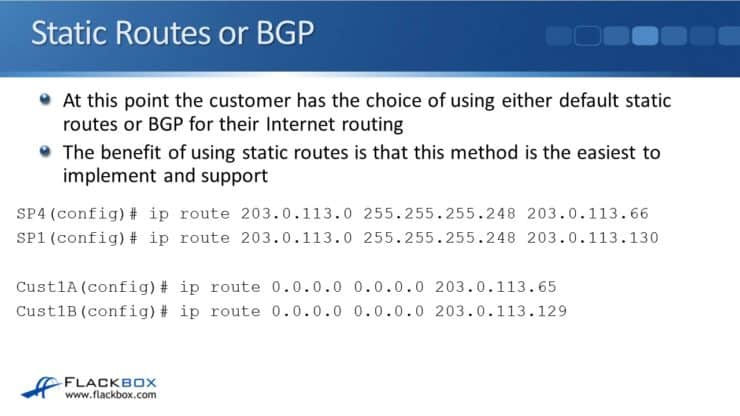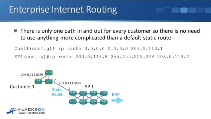 Looking at it from the customer's point of view, they have only one path in and out for Internet traffic so there is no need to use anything more complicated than a default static route. In the example here, Customer 1 sets up a default static route pointing at the service provider: