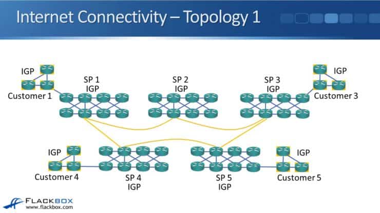 Continuing with the same topology from earlier in this series, we have five service providers and they have customers that are connected into them. Each customer is connected into a single service provider with a single link for internet connectivity.