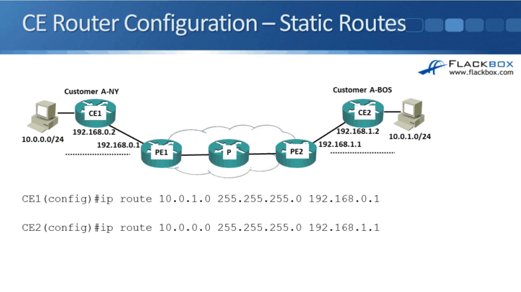 - On CE2, we've got IP route 10.0.0.0 pointing to the site on the left. The subnet mask is /24 and the next hop address is 192.168.1.1 on PE2.