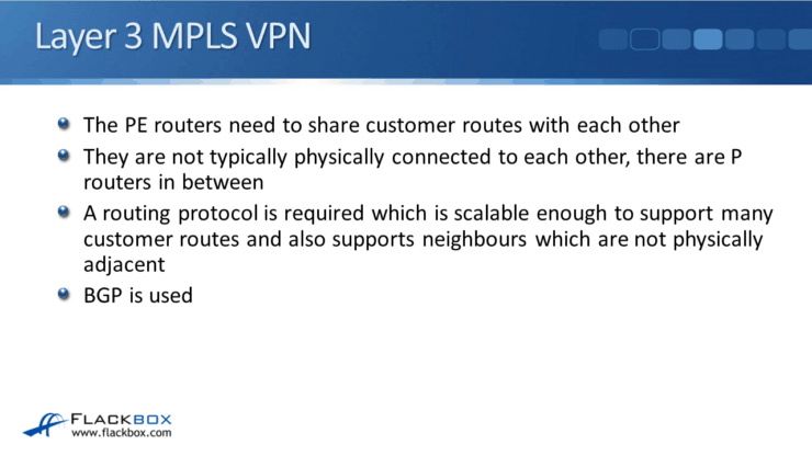 The PE routers are not typically physically connected to each other. There are usually going to be P core routers in between them. Therefore, our routing protocol is required to: