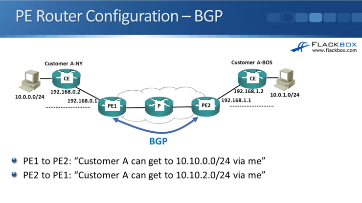 As shown in the diagram below, PE 1 tells PE 2 that "Customer A can get to 10.10.0.0/24 via me," and then routes to the customer site on the left.