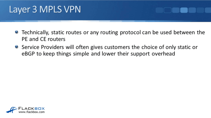 Technically, static routes or any routing protocol like RIP, EIGRP, SPF, etc., can be used between the PE and the CE routers.