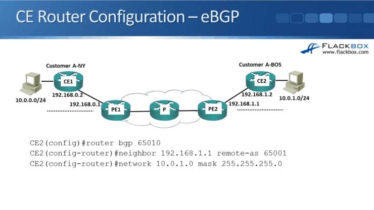 At this point, CE1 will form a BGP relationship with PE1 and the provider will configure the PE1 side. CE1, using eBGP, will advertise its internal networks over to PE1 then, PE1 will carry them in iBGP over to PE2.