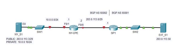 NY_S1 still does not have connectivity to EXT_S1 as it has been configured with a private IP address with no Internet connectivity. NAT must be configured to establish connectivity.