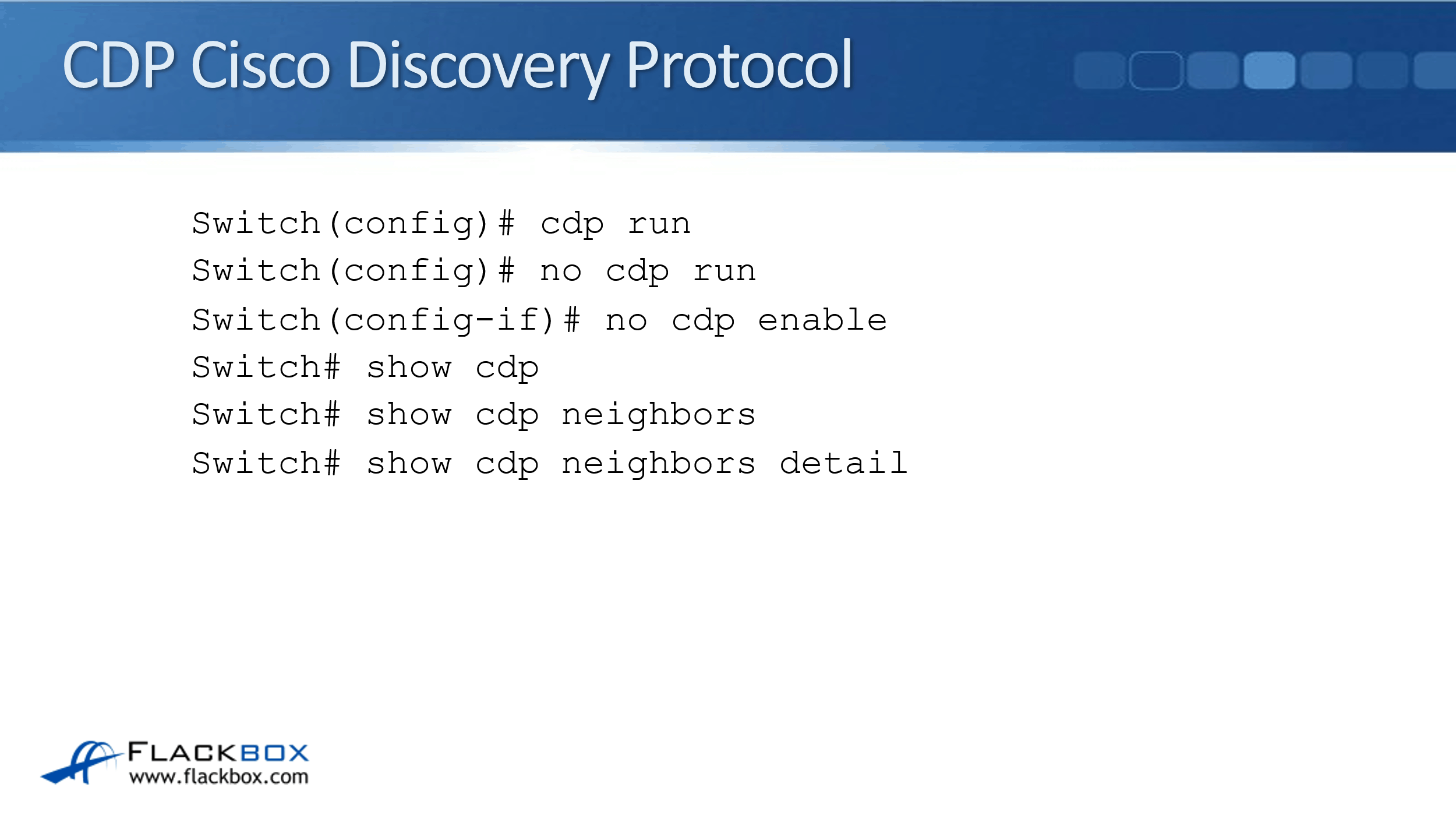 - show cdp – It shows if CDP is enabled or not, also the timers, etc.