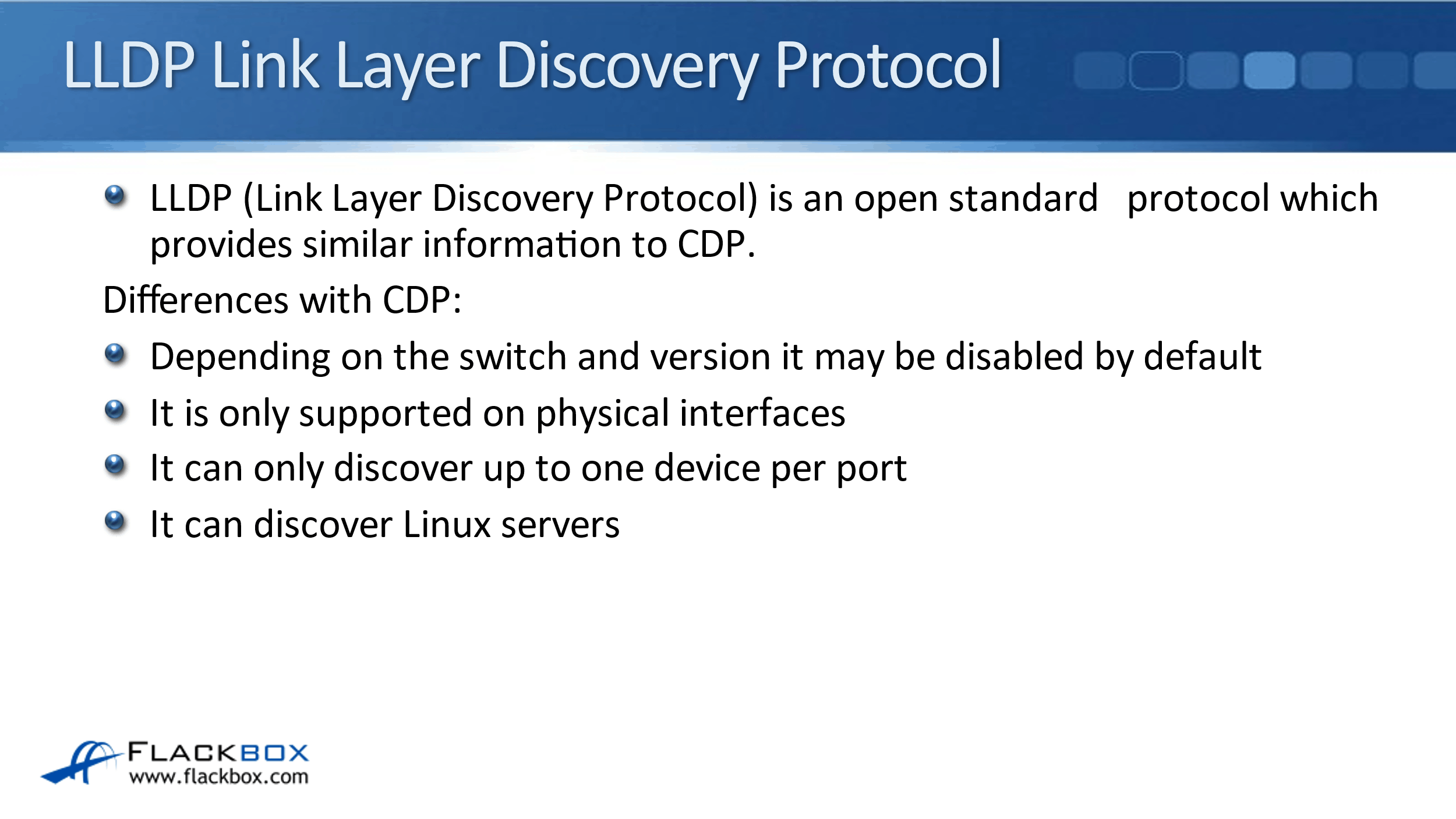 LLDP is the Link Layer Discovery Protocol. This came out a lot later than CDP did, and where CDP is Cisco proprietary, LLDP is an open standard. So, it's supported on most vendors' devices, and it provides similar information to CDP.