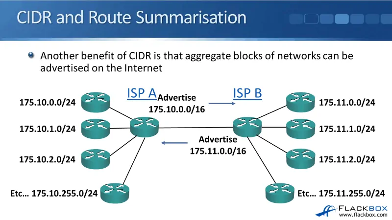 Rather than advertising all 256 /24s, ISP A advertises 175.10.0.0 /16 which is a superset of all those 256 smaller networks. ISP B then learns one route to all the networks behind ISP A, rather than learning 256 routes. ISP B will similarly advertise one route of 175.11.0.0 /16 to ISP A.