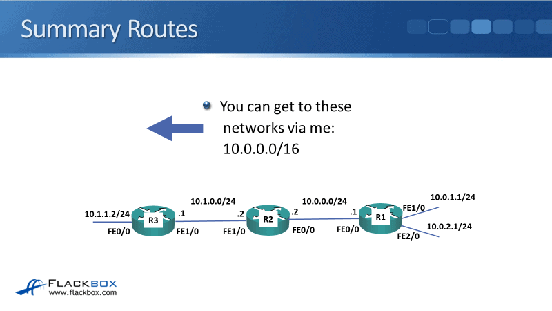 Using the same example, R2 is going to learn about the 10.0.1.0/24 and the 10.0.2.0/24 networks. But rather than advertising the 10.0.0.1/24 and 10.0.2.0/24 networks to R3, we can have this configured so it will send a summary route to R3, thus advertising 10.0.0.0.0/16 instead.