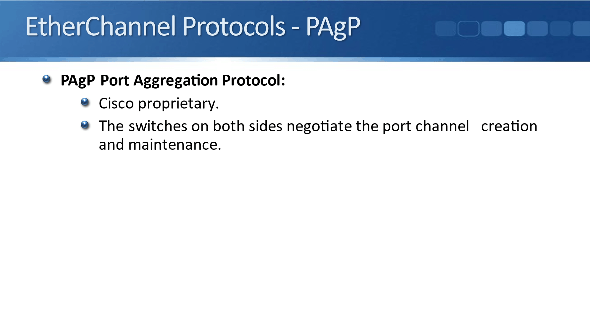 Next one we have is PAgP, which is Cisco's Proprietary Port Aggregation Protocol. This works similarly to LACP where the switches on both sides negotiate the port channel creation and maintenance. It's not recommended to use PAgP because it's proprietary.