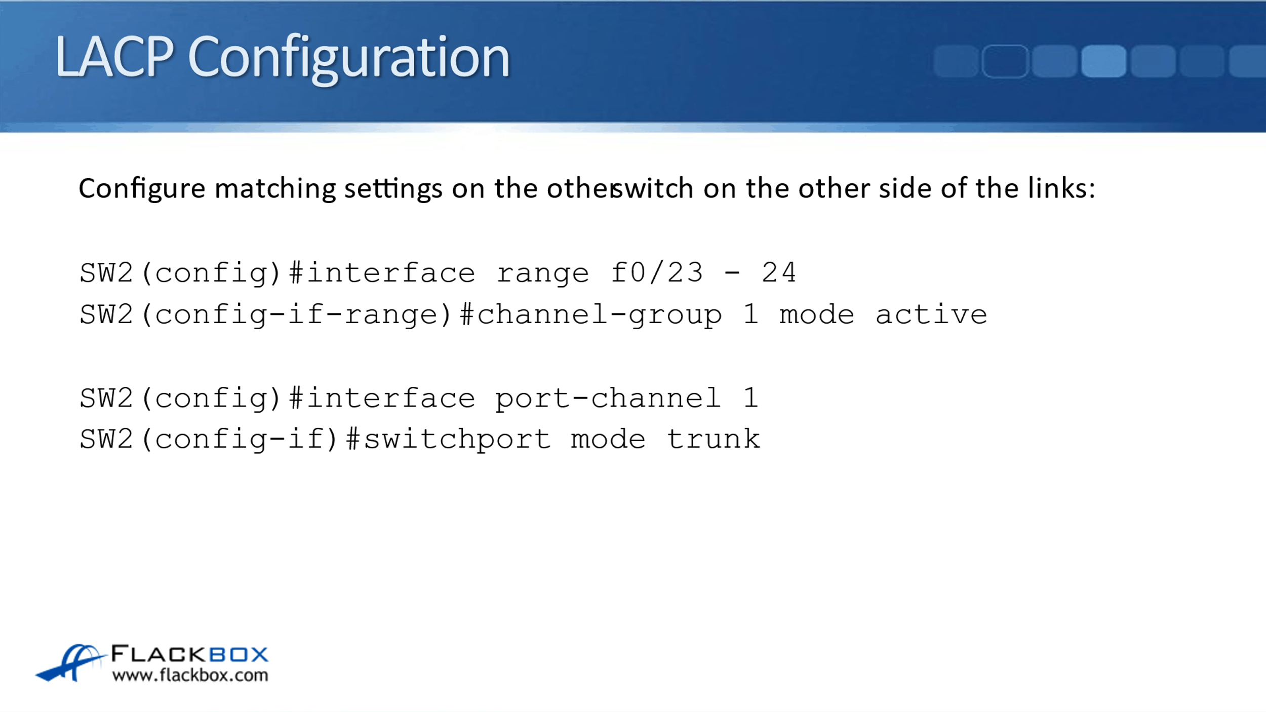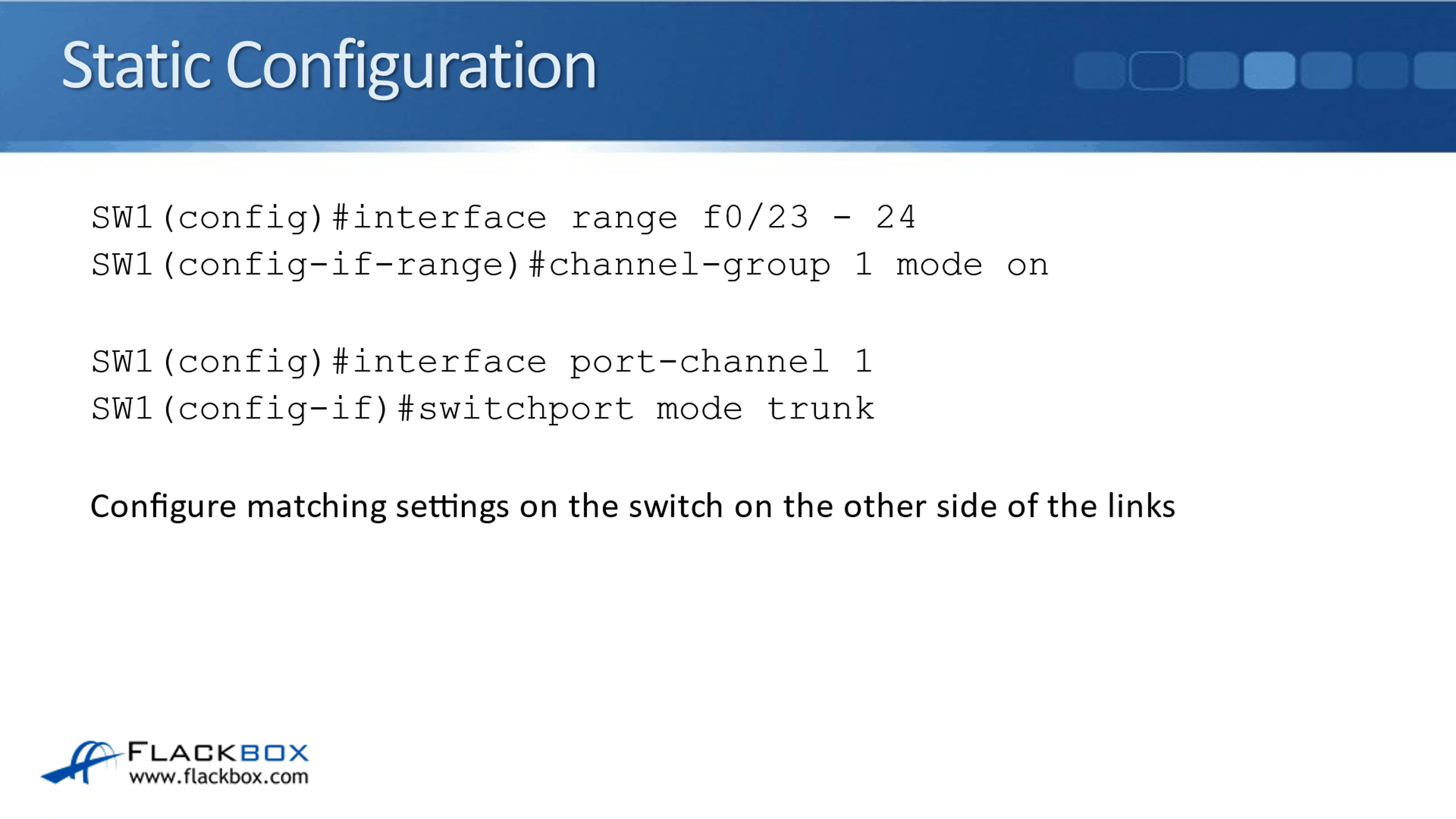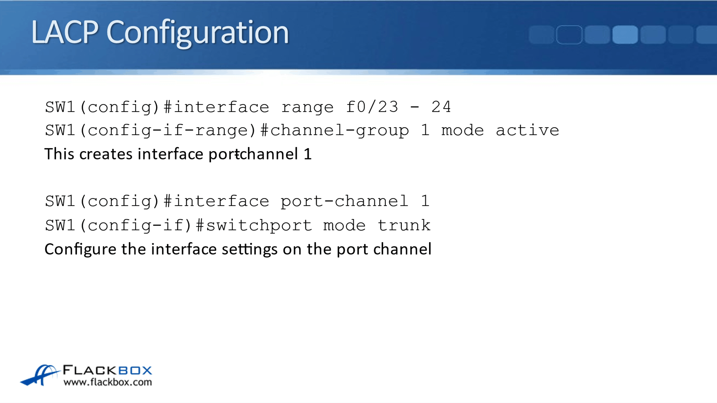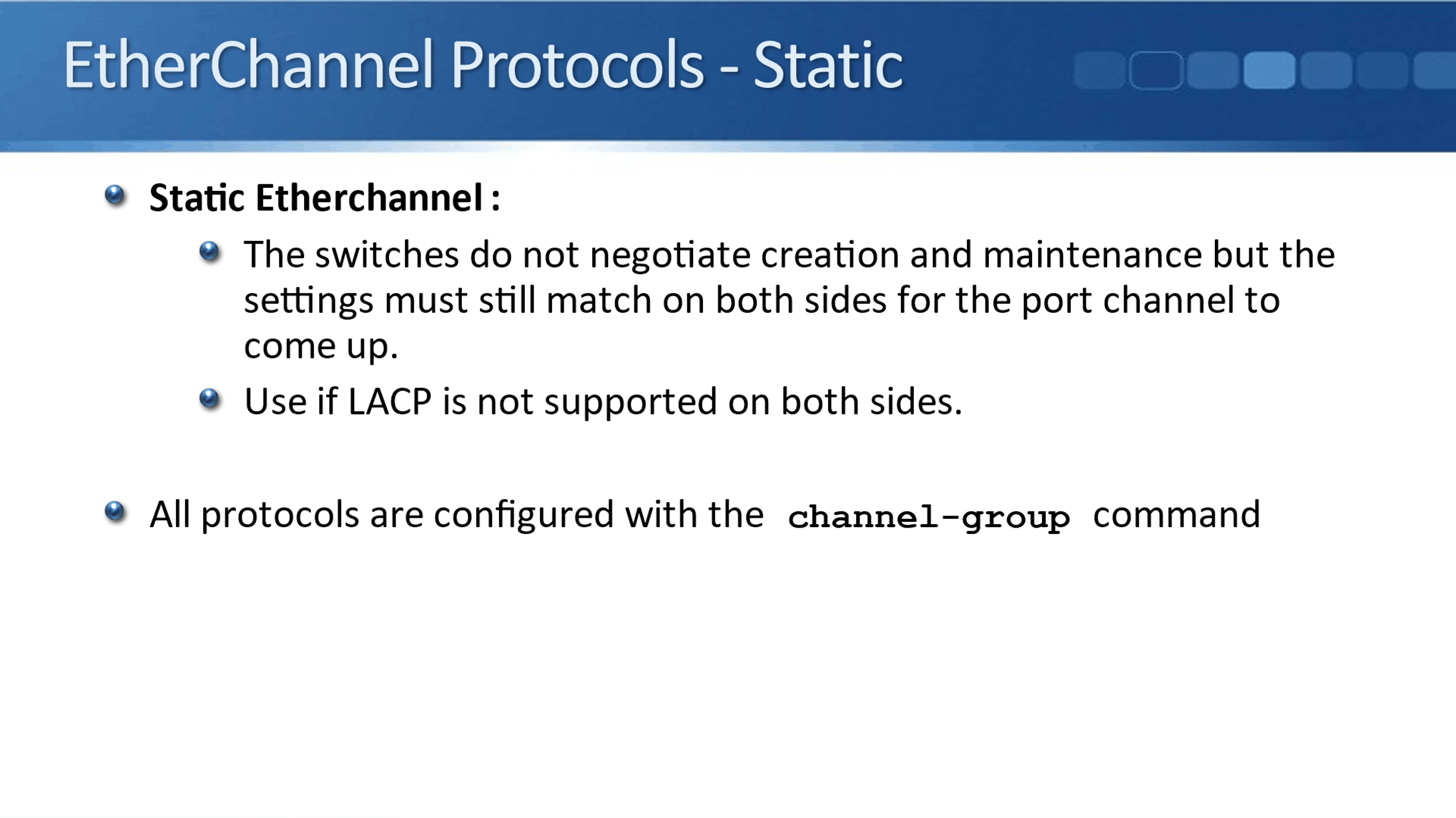 The configuration for the protocols is really similar. They all actually use the same command, which is the ‘channel-group’ command. It's on the keywords that we use along with channel-group that decides which of the three protocols is going to be used.