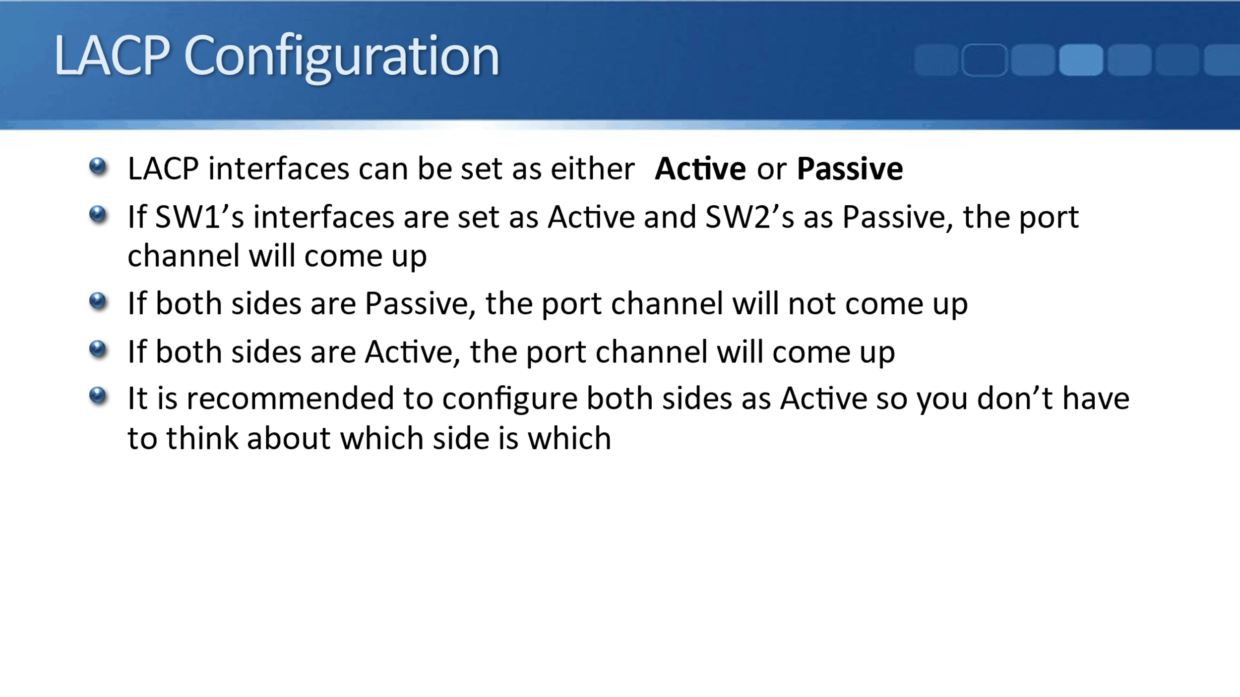 LACP interfaces can be set as either Active or Passive. Let's say we're going to configure a port-channel between SW1 and SW2. If SW1’s interfaces are set as Active and SW2’s as Passive, the port channel will come up. But if both sides are set as Passive, the port channel will not come up, and if both sides are Active, the port channel will come up.