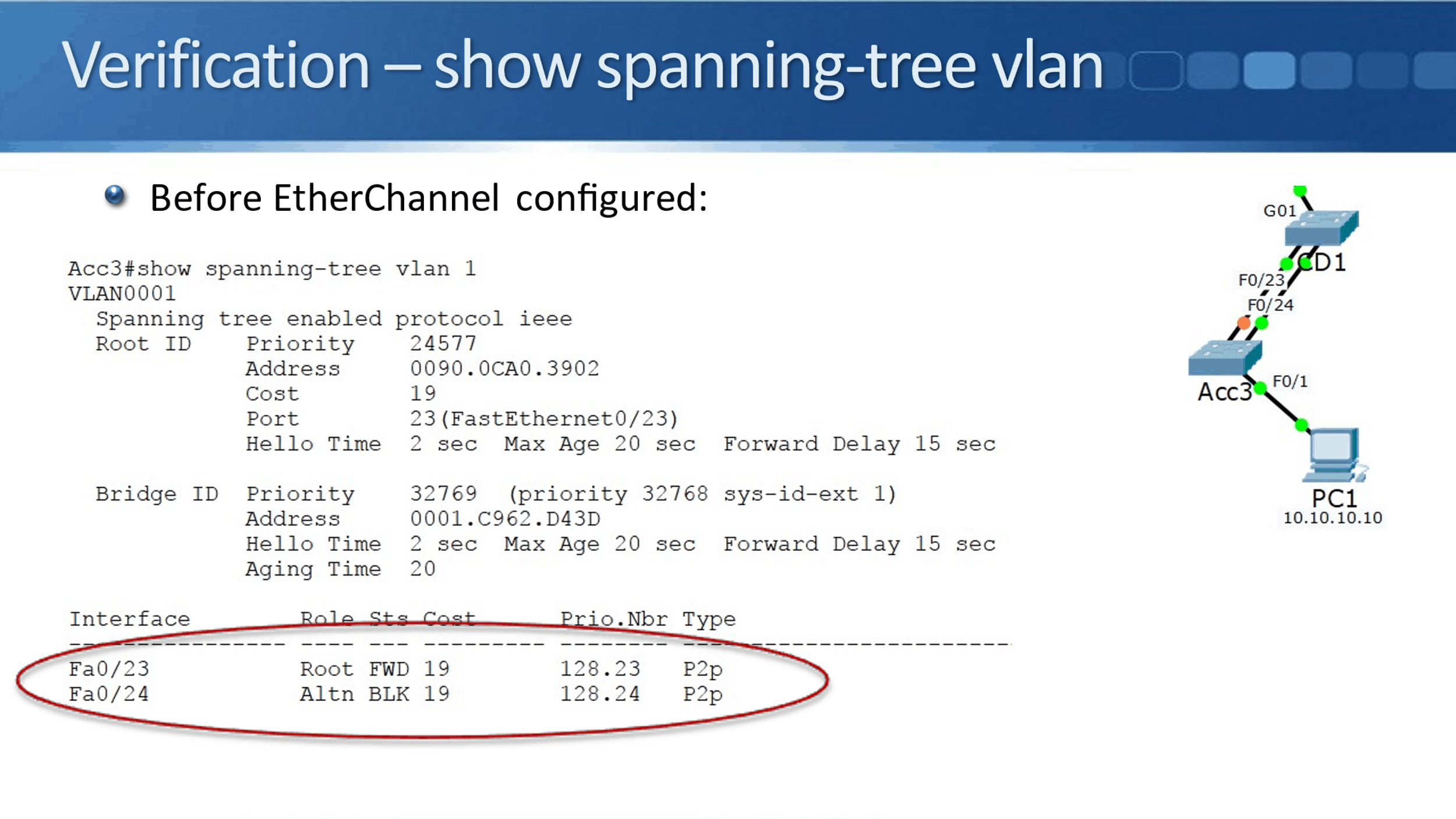 Before the port channel, you see that spanning-tree still has the physical interfaces, Fa0/23 and Fa0/24. When we put those in a port channel, spanning-tree just sees that one logical interface. It sees one link which is not a potential loop as far as spanning-tree is concerned.