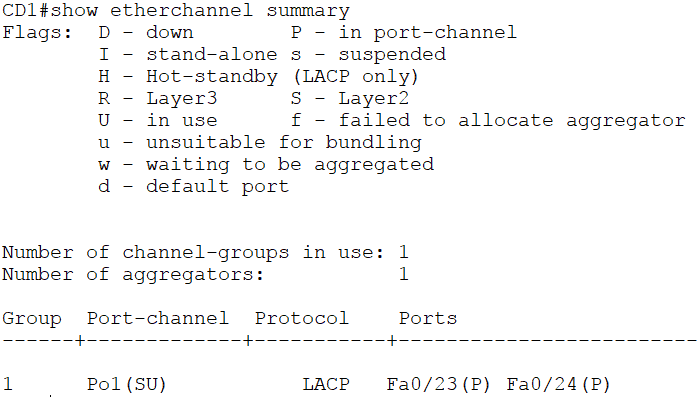 The capital letter U means it's in use, which basically means that it is up. I can see that the protocol is LACP, and over on the right, I can see that my ports are FastEthernet 0/23 and 0/24. A capital P means that they are in the port channel.