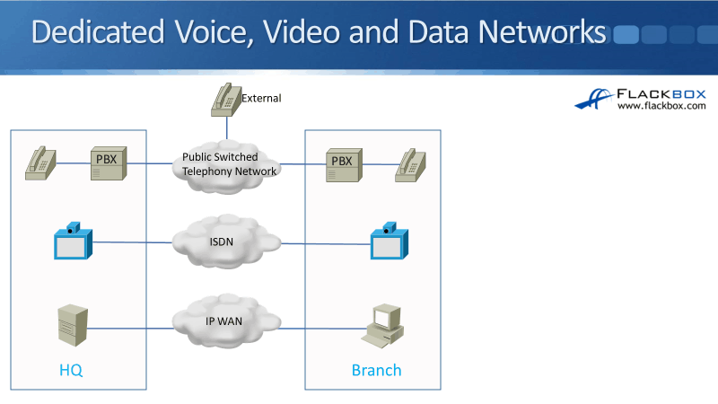 In the diagram above, the three networks for voice, video, and data are completely and physically separate from each other: