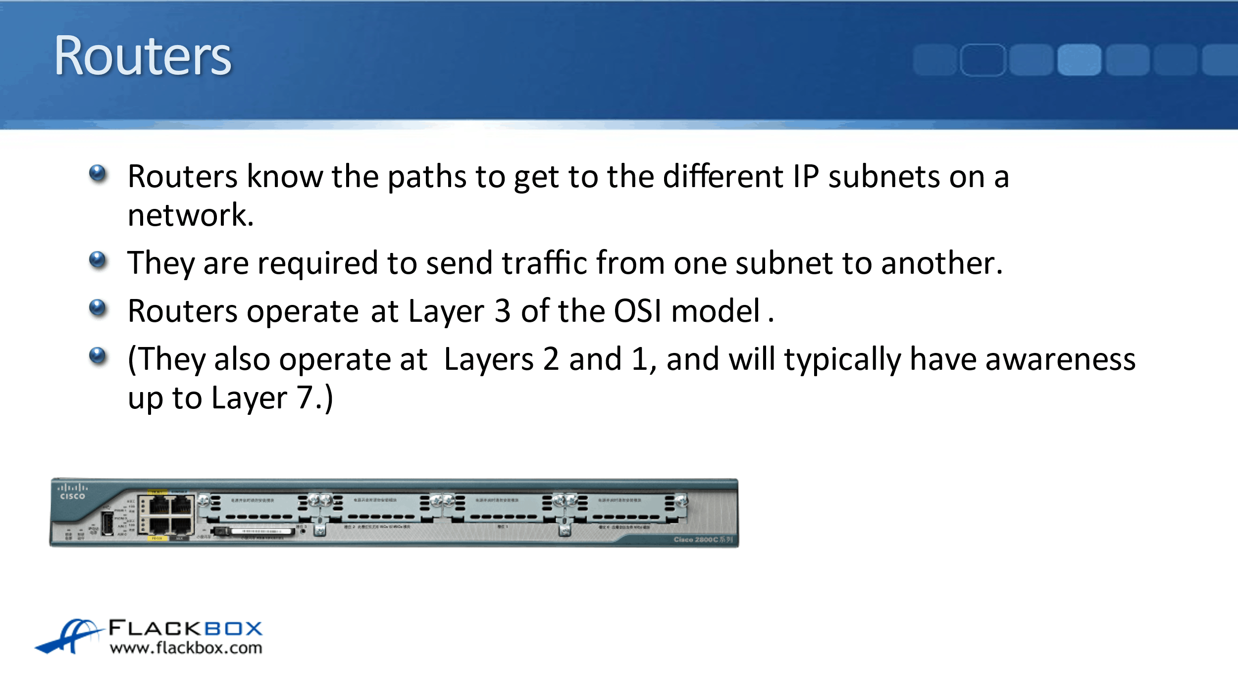 They route traffic between our different IP subnets. IP is at Layer 3 of the OSI stack. So a router operates at Layer 3 of the OSI model. Obviously, it has physical interfaces on there as well. So, it's also operating at Layer 1. It also needs to understand Layer 2 addresses, so it also operates at Layer 2 as well.