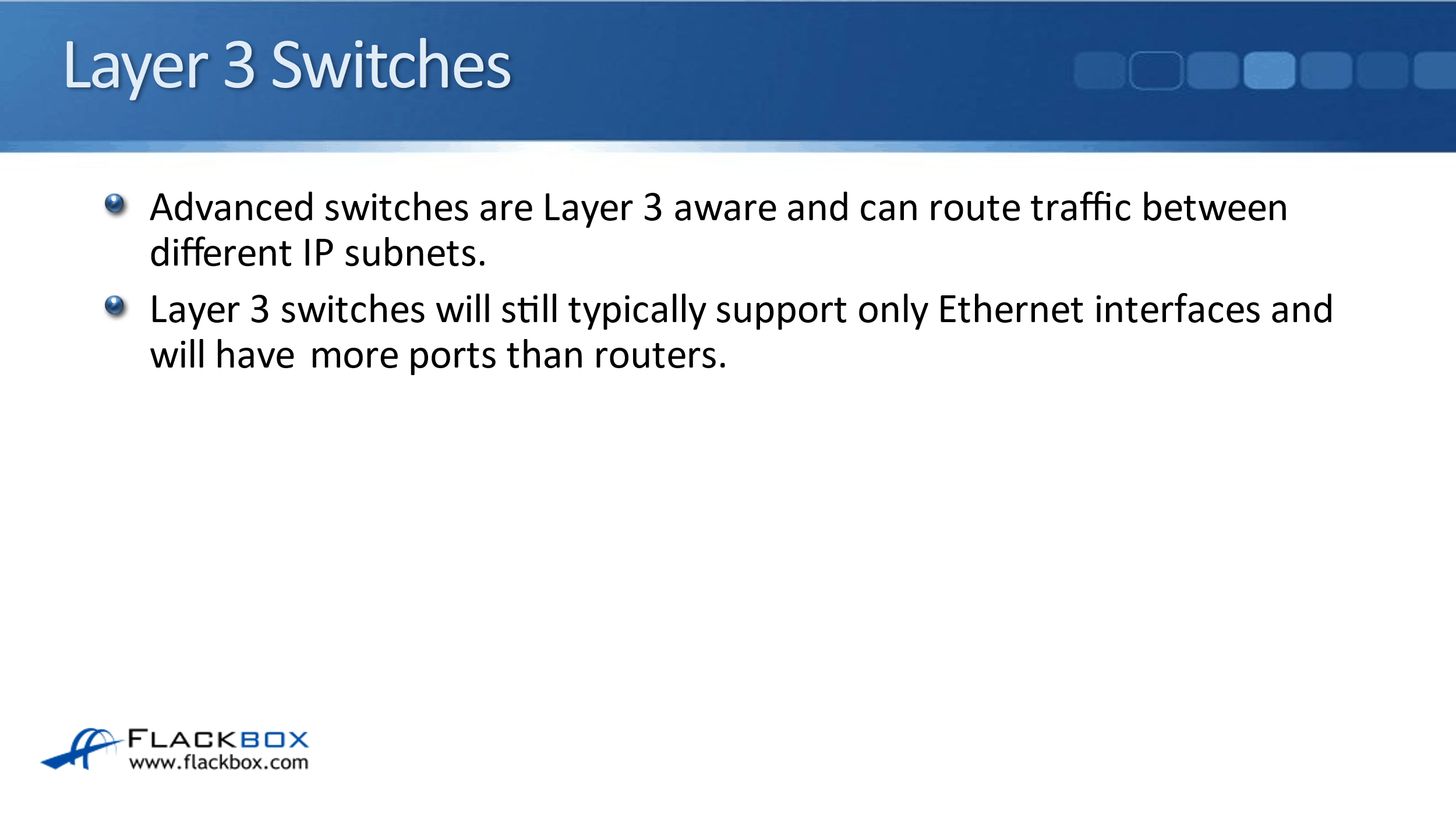 Okay, one other thing to tell you about here is that you can get advanced switches which are Layer 3 aware. It can route traffic between different IP subnets. When you get one of those Layer 3 aware switches, it's known as a Layer 3 switch.