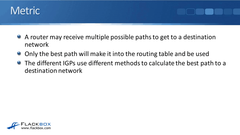 Out of all the paths that the router knows about, only the best path is going to make it into the routing table and be used. Thus, the different interior gateway protocols need some way to determine which is the best path by using different calculation methods.
