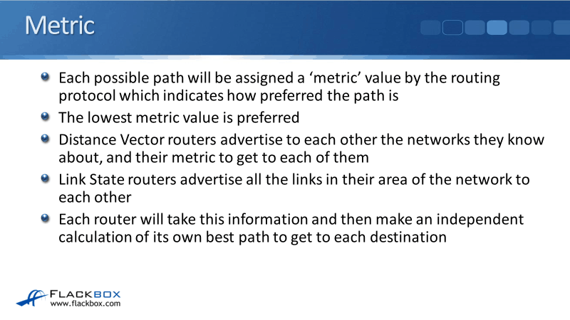 Each possible path will be assigned a metric value by the routing protocol which indicates how preferred the path is. The path with the lowest metric value is the most preferred path.