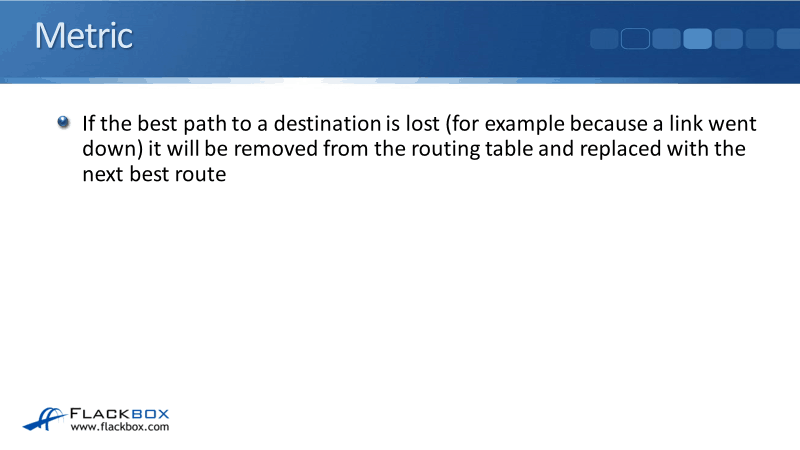 If the best path to a destination is lost, for example, a link went down, it will be removed from the routing table and will be replaced with the next best route. The route that has the next lowest metric will be chosen, if one is available.