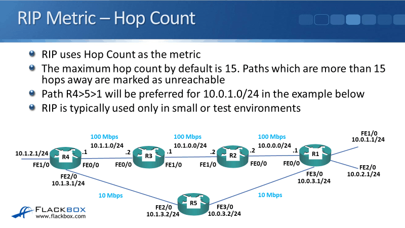 - RIP uses hop count and has a default maximum metric of 15. It's not usually used in production networks because of its scalability limitations.