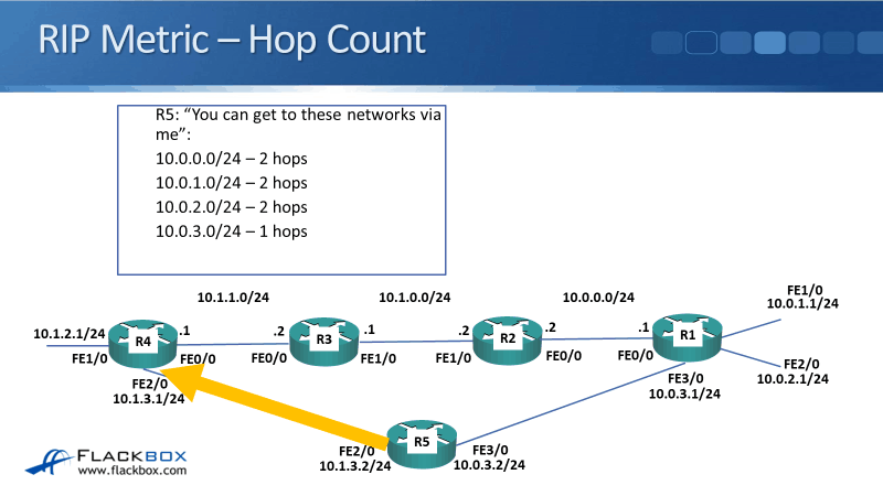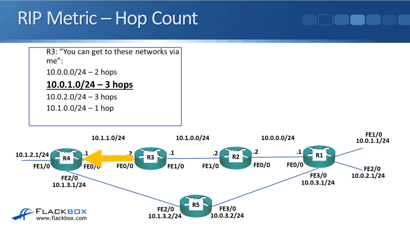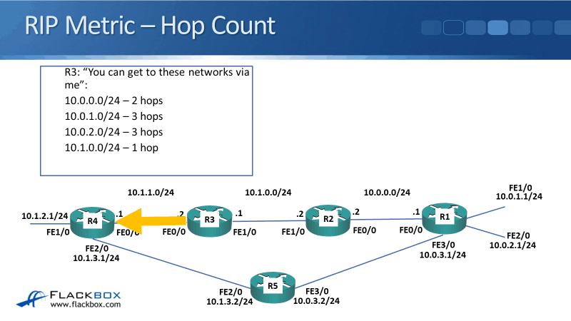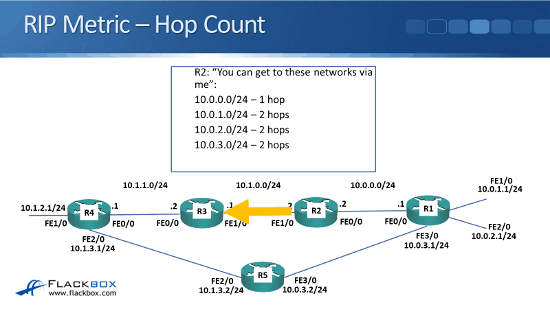 R2 will get that information and it will update its routing table. It will then pass the information on to R3. So R2 will say "Hey, R3, you can get to these networks via me. 10.0.0.0/24 is one hop because I’m directly connected to it, 10.0.1.0/24, 10.0.2.0/24, and 10.0.3.0/24 are two hops away."