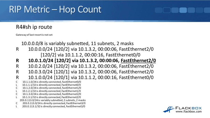R 10.1.0.0/24 [120/1] via 10.0.0.2, 00:00:03, FastEthernet0/0