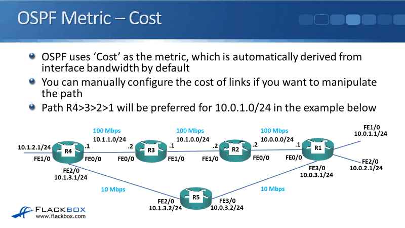 In the example below, we've got network 10.0.1.0/24 connected behind R1. From R4, all the links in the top path are a hundred megabits per second links. The links going down via R5 are all 10 megabits per second links.