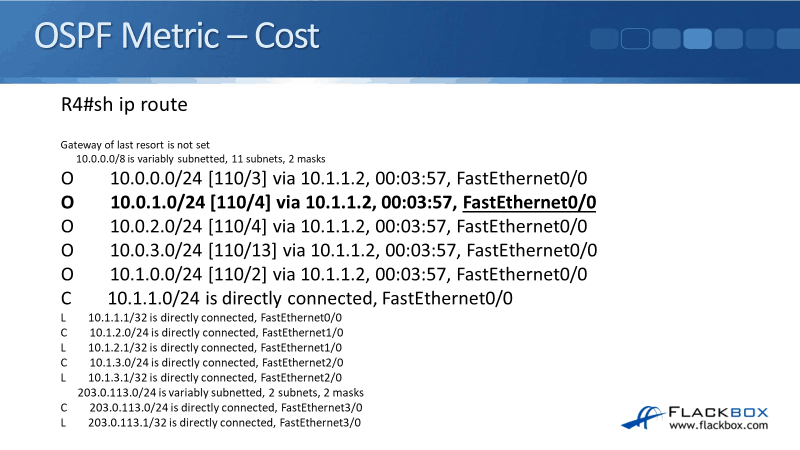 D 10.1.0.0/24 [90/30720] via 10.0.0.2, 00:04:48, FastEthernet0/0