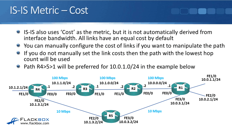 IS-IS also uses cost as the metric, but unlike with OSPF, it's not automatically derived from the interface bandwidth. All links have an equal cost by default.