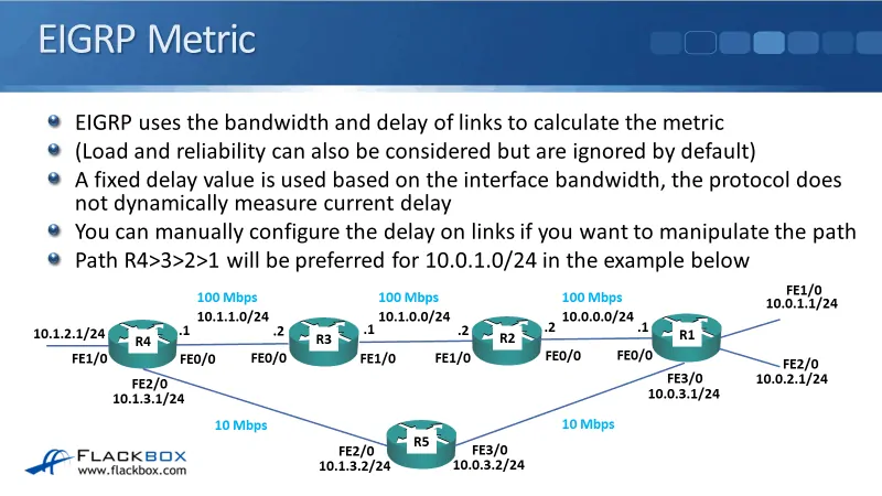 The last IGP we have is the EIGRP. It uses the bandwidth and delay of links to calculate the metric. Load and reliability can also be configured but they are ignored by default.